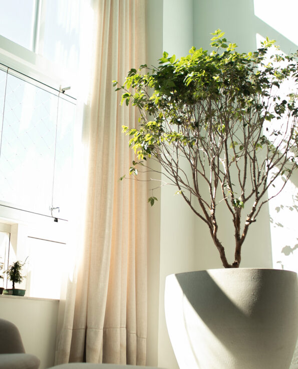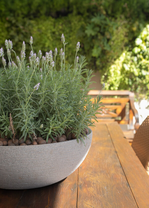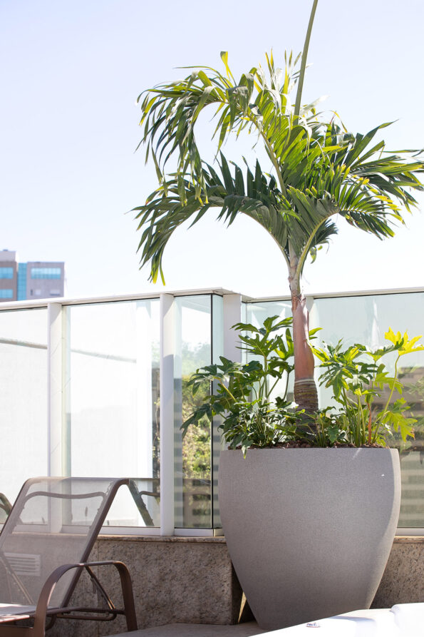 Dispusemos vasos arredondados altos com as palmeiras, combinando-as com com imbés de folahs largas para um toque extra de elegância. Utilizamos os mesmos vasos com plantas mais baixas, pois variar as alturas das plantas nos oferece um impacto visual diferente. Para os vasos mais baixos, escolhemos plantas A, B, C e Duma oliveira que ela tinha ganhado de presente e fizemos uma composição de ervas variadas.