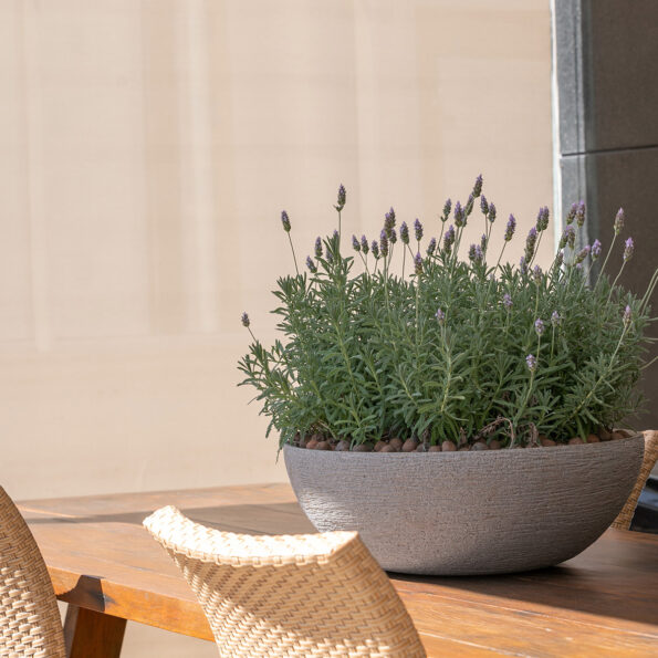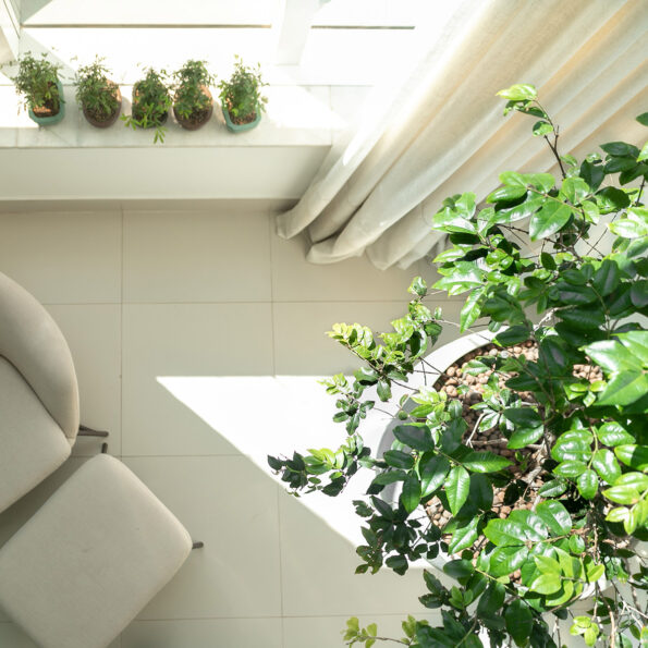 Optamos por um jardim vertical para dar mais frescor ao local devido à constante iluminação. Colocamos plantas era da folha larga, renda francesa, costela de adão X, Y e Z ao longo de uma das paredes, caindo em formato de cascata, trazendo não só cor como textura ao ambiente. Em cima de cada uma das mesas, optamos por um vaso baixo, largo e arredondado, em um tom claro para contrastar com o tom de madeira da mesa. Cada vaso estava recheado de lavandas, que traz um toque de cor ao ambiente e permite que a cliente se sinta ainda mais tranquila após o uso do seu SPA.