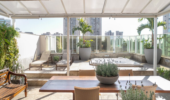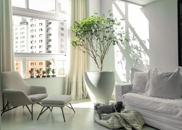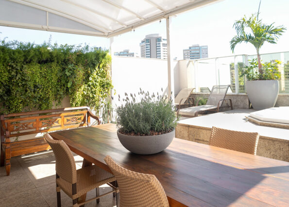Este foi um projeto especial, pois lidava diretamente com sonhos dos clientes. Fabi sempre quis ter palmeiras e um pé de jabuticaba em sua sala-de-estar, então levamos as plantas da sua memória afetiva, junto com outras plantas tropicais, à cobertura, trazendo à realidade o seu sonho de longa data.