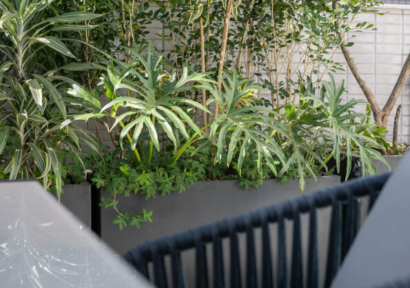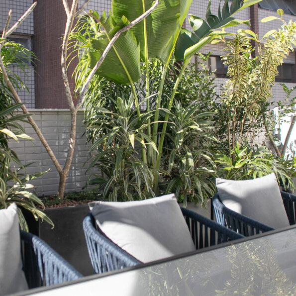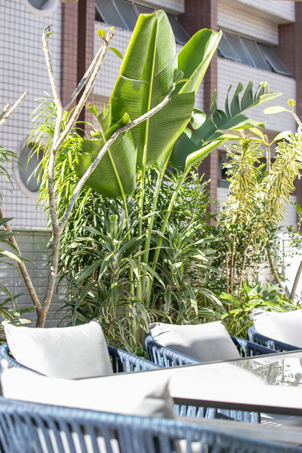 O paisagismo traz vida e frescor, com plantas escolhidas para criar um oásis verde.